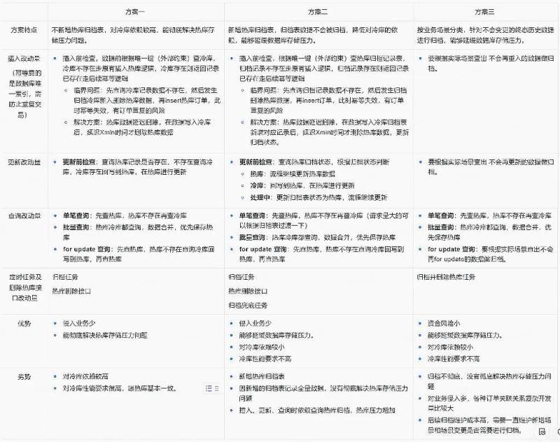 - 交易采用方案二新增了归档表,并且归档表里的存储的全量数据,仅能减缓交易和支付数据库的存储空间紧张情况,无法彻底解决数据库存储问题。