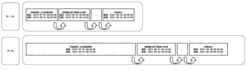 归档任务查询时间滚动机制:时间范围第一次起始时间为固定日期(财经支付订单最早点日期),结束时间为指定日期,下次开始时间等于上次结束时间,结束时间为上次结束时间加上指定时间范围)。每次查询下一个时间窗口时 redis 保存信息,指定日期,当天任务的时间范围,分页数。