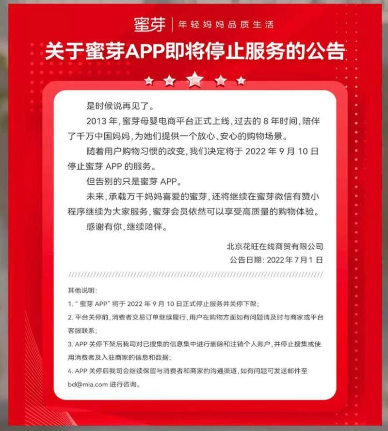 7月1日,蜜芽官网发布公告称,决定将于2022年9月10日停止蜜芽App服务。
