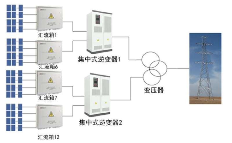 集中式光伏逆变器。将大量并行的光伏组件串连到同一台集中逆变器的直流输入端,汇总成较大直流功率,再转变为交流电的一种电力电子装置,其功率相对较大,单机容量一般为500kW以上。它具有输出功率大、技术成熟,以及电能质量高、成本低等优点,但其最大功率跟踪电压范围比较窄,组件配置灵活性较低,发电时间短,因此,要求光伏组件之间具有较高的匹配性,一旦出现多云、部分遮荫,或单个组串故障,将影响整个光伏发电系统的效率和产能。主要应用于光照均匀的集中式地面大型光伏电站等集中式光伏发电系统。产品转换效率高,电网友好性强,安全可靠,经济性好,能适应高寒、低温、高海拔等多种环境, 广泛应用于荒漠、高原、商业屋顶等大、中型光伏发电系统。随着技术进步近年来开始与下游的变压器集成,形成“逆变升压”一体化的解决方案,以及与储能结合的光储一体化解决方案。