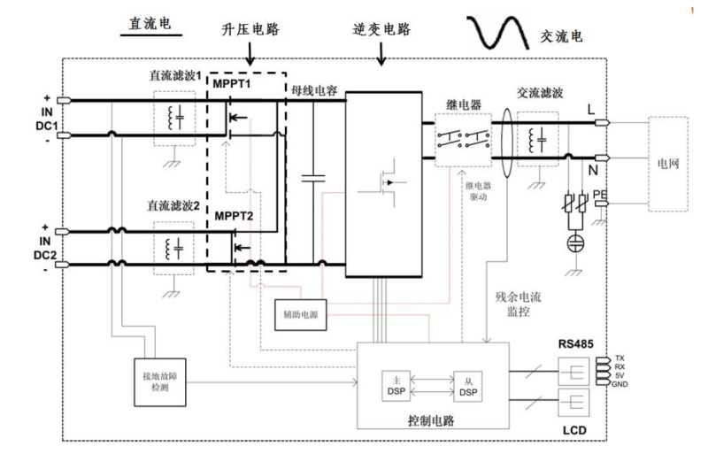 光伏逆变器是光伏发电系统的核心设备,其主要功能是将光伏发电系统所发的直流电转化成交流电,并跟踪光伏组件阵列的最大输出功率,将其能量以最小的变换损耗、最佳的电能质量用于电器设备应用或馈入电网。