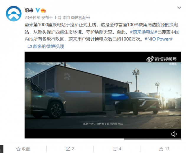 7 月 6 日消息,据蔚来官微消息,蔚来第 1000 座换电站于拉萨正式上线,这是全球首座 100% 使用清洁能源的换电站,至此,蔚来换电站已覆盖中国内地所有省级行政区,蔚来用户累计换电次数已超 1000 万次。
