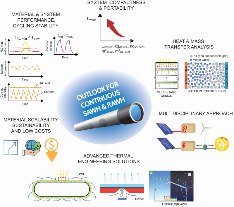 系统设计方面,对于吸附式取水系统,其设计应着眼于增加系统的紧凑性,并在系统水平上进一步平衡吸附与解吸速率的不匹配。作者分析了现有的分批轮换的连续性取水方式的总取水量和紧凑性的局限,提出通过吸附解吸面积的区别来匹配吸附和解吸动力学,以实现更高的取水量和取水效率,并提出采用各向异性热导率以及定向孔隙结构的材料可以带来额外的质量和能量效率。对于辐射冷却系统的设计,作者认为应该专注于如何将辐射冷却材料提供的冷却能量集中,即在较小的面积实现集中的高冷却功率以实现更低湿度下的冷凝。此外,还应特别注意辐射冷却整体的热管理,通过引入额外的辐射屏蔽层和隔热层,部署额外的遮阳板以屏蔽太阳辐射等方式,可以减少环境热量输入,提高系统的整体冷却性能。