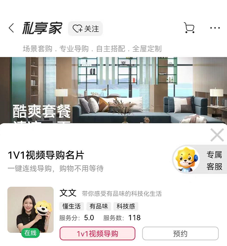 当然,3D样板间仍在不断丰富中,并未收录所有装修类型,与1对1定制尚有差距。为了补完服务,“私享家”增加了视频导购,可以做到1V1专业定制服务。用户可在与直播间的专业导购员连线,导购员通过视频给出个性化解决方案。