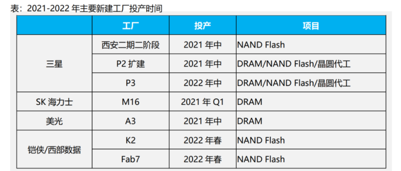 2021 年新增已经可以投产的 DRAM 工厂主要有:三星 P2、SK 海力士 M16、美光A3。
