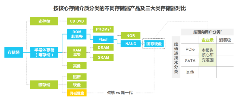 光学存储器典型性产品是CD、DVD;半导体存储器核心是RAM(易失)和ROM(非易失),常说的SSD固态硬盘就是其中的一类。磁性存储器典型性产品是机械硬盘。