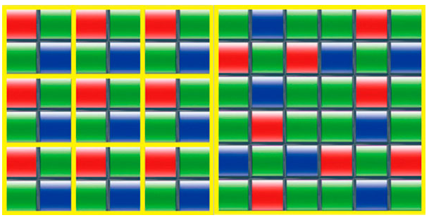 至于中间的Super CCD EXR(2009,下图),其结构类似于原始的Super CCD,但从左图改变了组成其滤色镜阵列的红色,绿色和蓝色像素的布局就像右图所示。