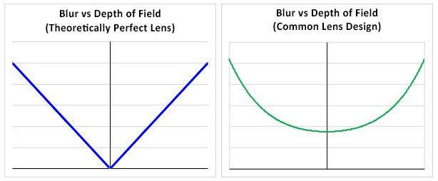 这些图在垂直轴上显示模糊,而在水平轴上显示焦距。(我们称它们为景深曲线或DOF曲线。)理论上完美的镜头恰好在一个焦点设置下进入了最清晰的对焦,如左图所示。在现实世界中,镜头的DOF曲线往往会有些平底,这取决于其分辨率极限。镜片设计师有时会故意使曲线的底部变平,但要权衡最终的清晰度以制造出更易于制造的镜片。