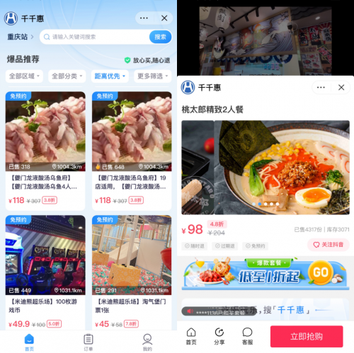 之所以能顺利在抖音打开局面,一方面是平台机遇,另一方面,是千千惠在行业内长期沉淀积累下来的一套完整的爆品打造能力——千千惠创始人陈家鼎带领的创业团队2014年起就进入本地生活服务市场,拥有在餐饮、酒店、旅游票务等多个行业探索本地生活服务的经验。