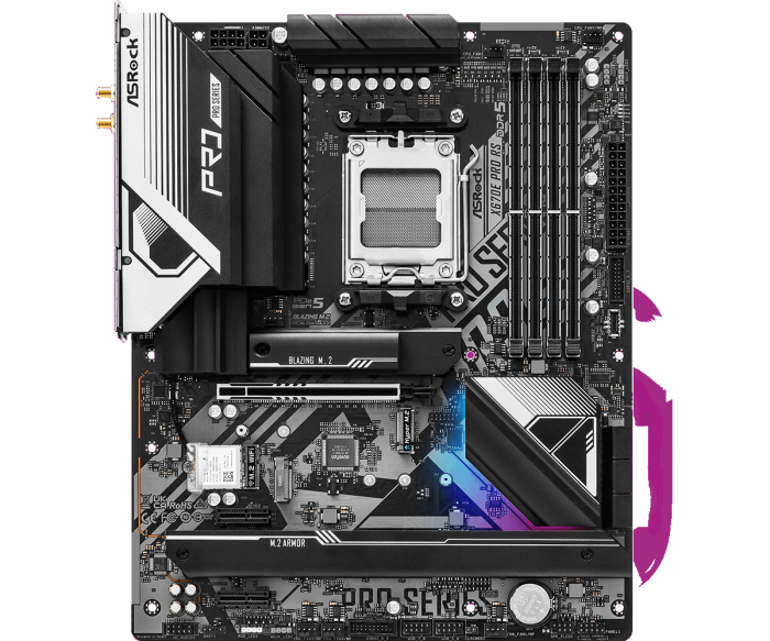 这次展示的照片,已经让我们看到被无线网络适配器填充的 M.2 WiFi 插槽,以及一条直通 CPU 的“Blazing M.2”和三条 PCIe 4.0 M.2 插槽。。