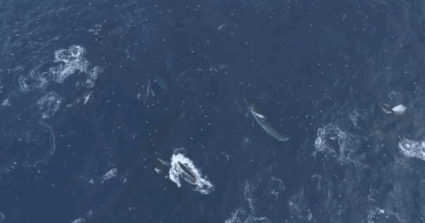 他们的调查发现了巨大的鲸鱼群体在捕食磷虾,这是该地区最重要的物种之一,有两次观察估计约有150头鲸鱼都在捕食磷虾群。他们指出,这是文献中最大的须鲸聚集地。摄食狂潮只持续了几分钟,然后鲸鱼又分散开来。