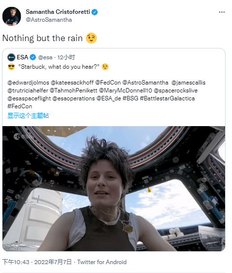 Cristoforetti对欧空局在Twitter上分享的视频做出了恰如其分的回应,"Starbuck,你听到什么了?"这是阿达玛上将的一句话。宇航员像Starbuck那样回答:“除了雨,什么都没有。”
