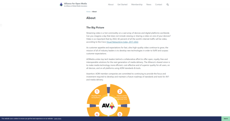 据公开资料,开放媒体联盟是一个发展开放影像编码的非营利组织,目标是开发免专利的影像编码格式,作为 VP9 影像编码的继任者,取代需要专利的 HEVC 影像编码,创立成员有 Amazon、Apple、Cisco、Facebook、Google、Intel、微软、Mozilla、Netflix,该联盟的目标是在 BSD 2 授权条款下发展一个新的影像编码格式,会从 Daala、Thor 和 VP10 中取用元素。