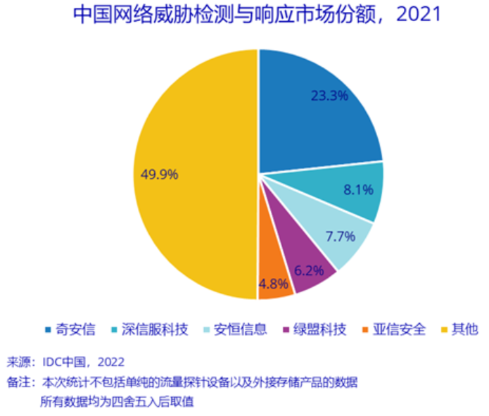 本文引用地址:http://www.eepw.com.cn/article/202207/436029.htmIDC于2022年7月正式发布了针对中国NDR产品的市场份额研究报告,即:《中国网络威胁检测与响应市场份额,2021:实战效果显著,市场需求明确》(# CHC48497322)。报告针对2021年中国网络威胁检测与响应市场的规模、增长速度、主要玩家、市场与技术的发展趋势等内容进行了详细研究。报告数据显示,中国网络威胁检测与响应市场在2021年实现了36.6%的同比增长,规模达到3.1亿美元。该市场头部玩家仍然以综合型网络安全解决方案提供商为主,例如奇安信、深信服科技、安恒信息、绿盟科技、亚信安全等,同时,众多专业创新型厂商也在该领域表现出强劲的增长态势,具体情况详见下图: