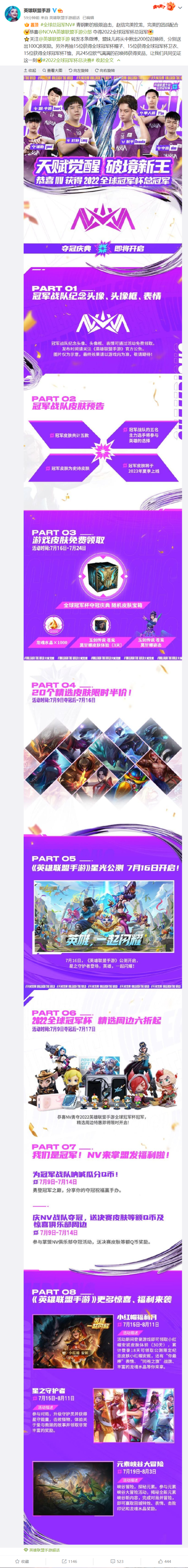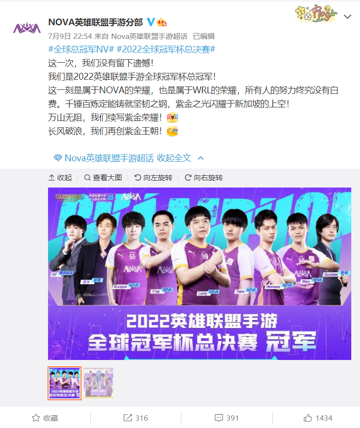 IT之家 7 月 10 日消息,北京时间 7 月 9 日晚上 10 点 55 分,2022 年英雄联盟手游全球冠军杯总决赛在新加坡落下帷幕。为期 25 天的比赛中,来自全球八大赛区的 24 支电竞队伍为了最终的冠军头衔展开激烈争夺,最终中国大陆赛区的两支队伍 NV 与 JT 会师今晚的总决赛,经过四局激烈对战,NV 以 4:0 的比分完胜 JT,夺得首届全球冠军杯冠军。