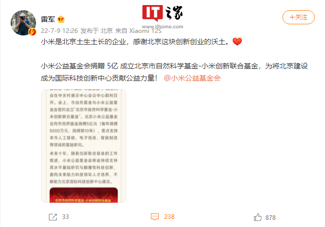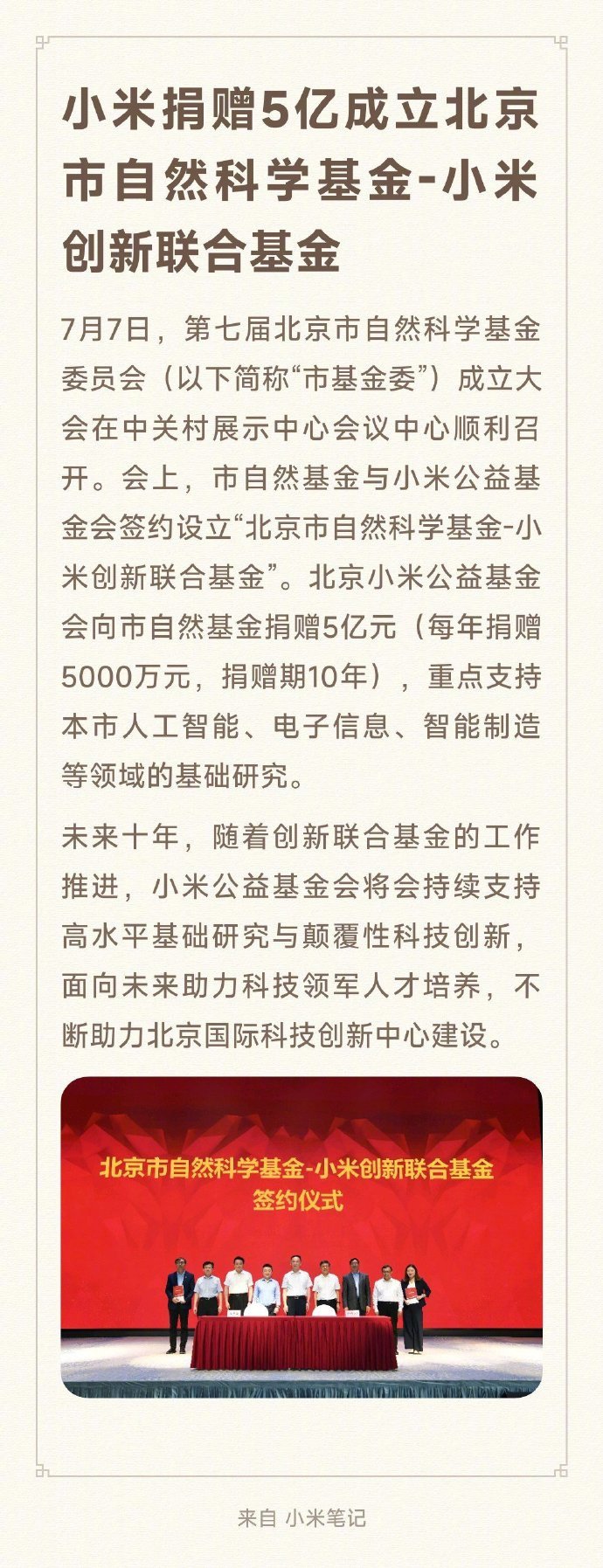IT之家 7 月 9 日消息,小米创始人兼 CEO 雷军今日在微博发文称,7 月 7 日,第七届北京市自然科学基金委员会 (以下简称“市基金委”) 成立大会在中关村展示中心会议中心顺利召开。会上,市自然基金与小米公益基金会签约设立“北京市自然科学基金-小米创新联合基金”。北京小米公益基金会向市自然基金捐赠 5 亿元 (每年捐赠 5000 万元,捐赠期 10 年),重点支持本市人工智能、电子信息、智能制造等领域的基础研究。
