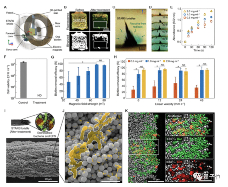 通过这个控制平台,IONP 就可以变成具备一定刚性,类似于鬃毛一样的形态,这些鬃毛可以像牙刷一样,刺穿牙齿表面的生物膜,直达牙垢覆盖面进行清理。