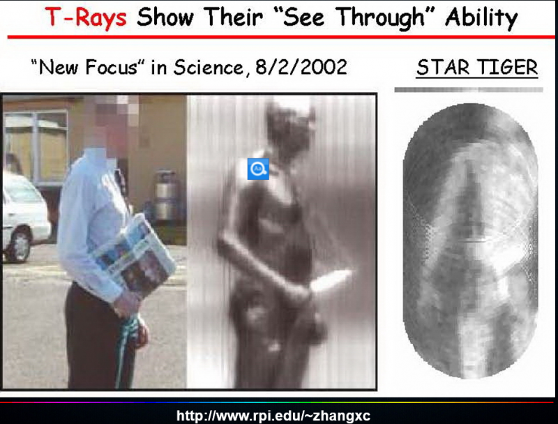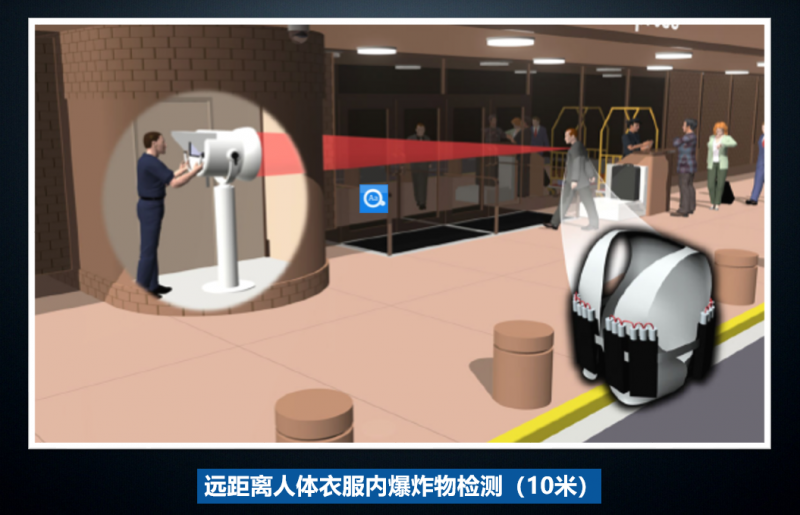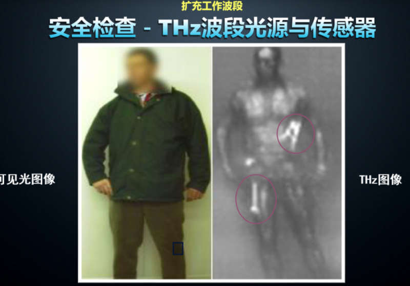 中间这张图是可见光的图,看出来没有带什么东西。但是用太赫兹波对他成像,那就是左边那张图和右边那张图,可以看到他上面带了很多武器。现在很多地方检测,比如美国的飞机场,都用太赫兹波在很远的地方检测你身上有没有带危险的东西。