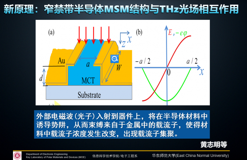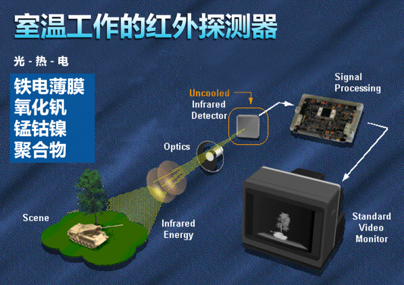 我带来一个手机,这个Iphone,我们拍照只能拍可见光的照片,灯关掉照片就拍不出来了。图上有一个附件,就是一个红外探头,把它装到Iphone上,就可以拍红外的照片,也就是说把灯关掉也可以拍照。我们看看这个照片,照片里的人像谁?这个照片就是我在办公室里。这张照片就是一张红外的照片,我们人有两种光传到你的眼睛里,一种光是反射光,也就是灯光,外面的太阳光照在我的身上,反射到你的眼睛里,你就看到我了。如果没有灯光,外面没有阳光,晚上是暗的,反射光就没有了,你用你的眼睛就看不见我了。但是我们人除了反射可见光以外,人自身还会发出红外光,因为我们人有温度,37度,换成绝对温度就是300多K。任何一个有温度的物体都会发出热射线,人体(300多K绝对温度)发出的波长大概在10微米左右。所以我们眼睛看不见,但是用我们红外探测器就可以看得见了。这张照片就是用红外传感器对我人体拍出的照片。再举个例子,最近澳大利亚森林大火(视频00:10:17),有一些动物还在里面,我们从视频里面可以看到它在卫星上通过红外热像仪就可以找到在森林里面动物还有没有,因为动物也是发红外线的,就可以看出来了,可以通过红外线找到在森林里还存在的生物。我上面举的例子都是室温工作的传感器,灵敏度差一点,但是比较便宜比较好工作,这也就是室温工作的传感器。主要用贴片薄膜、氧化钒、锰钴镍或者聚合物做这些传感器,它可以方便地应用,价格比较便宜,当然它的灵敏度稍微低一点。灵敏度高的用什么呢?就是用半导体材料,光电导型、光伏型的,光打到这个半导体材料上来,它的电阻发生变化。或者光打到半导体材料做成的器件上,两端会产生电。(动画,00:11:46)我们可以通过视频看清楚,光打到半导体材料里面,就产生电子和空穴。电子带负电,空穴带正电。电子和空穴在里面就会移动,移动过程当中也许他们会碰到复合中心,就复合掉了,就没戏了。但是也有一些电子和空穴他们迁移比较长,寿命比较长,他们会有幸跑到p-n结里面去,p-n结里面有内在电场,就把电子和空穴分开了,向两端输出了,就可以发电了。半导体材料红外最好就是碲镉汞半导体材料。碲镉汞半导体材料在低温下工作灵敏度非常高,做成的器件可以把它做成焦平面列阵,像素做得很多。做好了以后可以放到相机里面,相机可以放到飞机上,那就是对地观测,航空遥感。也可以把这个相机放到卫星上对地观测,那就是航天遥感。技物所2016年12月份放了一个风云四号气象卫星,这个气象卫星非常好,里面有很多波段的碲镉汞的,还有其他半导体材料的红外探测器,很多波段。这张图上一共有15张图:每一张图都是一个通道的成像,就能够很灵敏地把我们对大气进行观测,我们在卫星上还做了一套观测仪,非常好,对大气做CT,也就是这个大气每一层每一个空间位置的温度、湿度都可以做出来,这样一件事情就非常了不起,相当于对我们大气做CT,在国际上都没人做过,大概五年以后才能做这个事情。这是非常了不起的一件事情。现在气象报告台风预报非常准,知道它什么时候到哪里,有多少速度在运动。为什么可以做:到这么精确呢?就是因为我们有卫星在天上看。不仅白天可以看,晚上也可以看,因为我们有红外传感器、有红外成像。大家都在玩手机,手机里有微信,微信打开有一幅图:就是一个云图,地球上风云的图,这张图是美国NASA的一张图,但是我们风云四号卫星上去以后,曾经用了风云四号的图,非常清晰,清晰度完全一样。当然这个图用了5天就换过来了,为什么呢?因为有协议的,腾讯说好微信是用那张图的。但是我们看到风云四号气象卫星的图是非常清晰的。第一个是图像,可以看到物体的空间分布,黑暗的背景也可以进行观测。第二,有热像,可以看到物体的温度分布。第三,可以看到它的谱像,看到我们的物体表面反射的光的光谱是怎么样的,有三个功能。这三个功能图像最简单,晚上看到一些图像。不仅白天可以看,晚上也可以看到这个图像。比如有一个红外应用,(视频,00:16:20)据说是美国和ISIS打的红外图像,就是伊斯兰恐怖组织汽车在路上开。这个消息卫星上就看到了,就定位了,定位以后通知他们指挥部,指挥部通知导弹发射部,导弹就把ISIS这个车子打掉了,这就是红外在里面起的作用。最近今日头条也发布了一条消息,(视频,00:17:09)美国公布了一个用红外相机拍摄到的UFO不明飞行物图像,十天前在网上传得蛮多,这也是用红外相机。红外相机看到它在云层上面,UFO那样的东西在移动,这是什么东西很多人不知道,很多有兴趣的人在研究,这个公布的视频也是用红外相机拍到的。红外相机要能够看得很清楚,就需要我们的探测器非常灵敏。探测器要非常灵敏,有一个条件,要把像素做得很大。比如我们手机现在是1000万象素,拍照片蛮清楚。过去我们手机只有200万象素,拍照就不清楚。像素要多,现在红外也是这样是美国Raytheon(雷神)公司的一个超大规模碲镉汞的红外焦平面,他是16个2K×2K的器件,也就是6400万像素,所以拍照片很清楚。