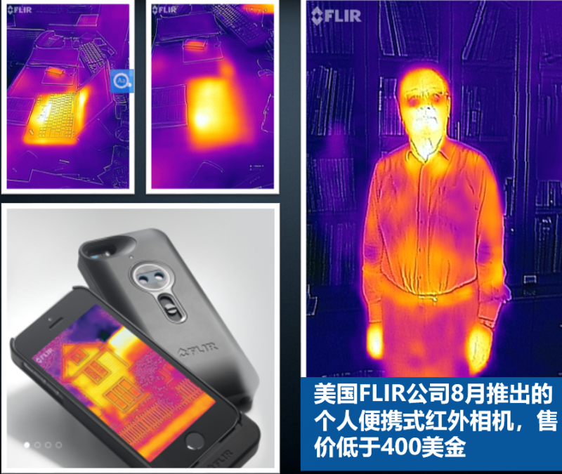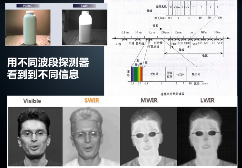 再比如这个人前面有一个硅片,后面的字遮住了,但是可见光的照片拍不出来,因为硅片把可见光遮住了,但是用短波红外来看可以看得出来,后面的字是SENSORS。再看这个人,胡子鬓角迹,可见光的照片,一个美男子。但是用短波红外来拍,这个鬓迹和胡子都是假的,这个人要么是野人演员,要么是可疑分子。不同的波段可以知道不同的信息,这里面要做科学研究。这张图里每一条曲线表示一种器件,这里面要研究它的物理、材料学、工艺学,把这些掌握好,我们才能做出不同波段的高性能的传感器。最近人家还在做近红外的成像: