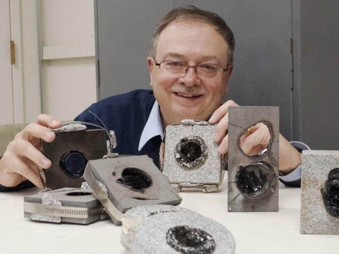 沃斯科夫利用回旋加速器光束汽化岩石的想法使他走上了从未真正停止的研究之旅。在MITEI的一些资助下,他开始进行测试,很快他的办公室里就堆满了他用麻省理工学院等离子体科学和聚变中心的小型回旋振荡管发出的毫米波爆破的小岩层。