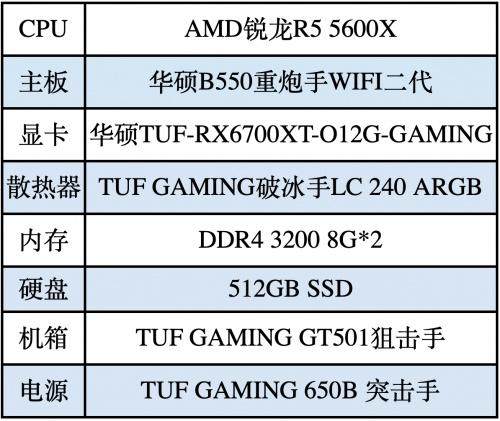 除了Intel平台外,为广大A饭们推荐以华硕B550重炮手WIFI二代主板为核心,搭配锐龙R5 5600X处理器、华硕TUF-RX6700XT-O12G-GAMING显卡等硬件的AMD锐龙超燃主机平台。其作战性能十分强悍,可为玩家带来畅爽游戏体验。