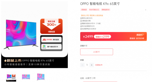 4月28日上午10点,OPPO 智能电视 K9x 65英寸,在OPPO商城、京东、天猫平台正式开售,售价2499元,首销期官方补贴300元,到手价2199元。现已开启预售,预售期间还有腾讯视频会员月卡和京东平台两年延保等惊喜福利,不过最让人心动的还是对K套装,即OPPO K10手机搭配全新上市的OPPO 智能电视 K9x 65英寸,第二屏半价价格是3248起步。