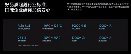 另外,OPPO智能电视K9x的做工也值得称道。通过了Rohs认证,安全可靠,还经过了264项列极限机器测试,有效工作时间更是达到了80000小时之久,具备超越行业标准的优秀品质。