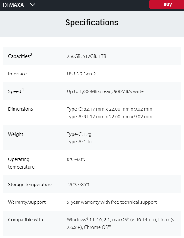 兼容性方面,DT Max 系列闪存盘能够在 Windows 8.1 / 10 / 11、macOS 10.14+、Linux 2.6+、以及 Chrome OS 设备上轻松使用。
