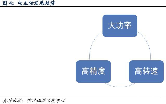 (1)大功率:电主轴向高速大功率.低速大扭矩方向发展。根据实际应用需要,大多数数控机床在低速粗加工时需要满足重切削的需要.高速切电主轴在高速切求,因此电主轴应具矩的要求.高速大功率性能。