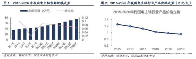 中国是世界主要的电主轴市场,仍有巨大的发展空间。中国电主轴市场正处于快速发展阶段。2019年,中国电主轴行业市场规模达到44.27亿元左右,同比上涨约57亿元.6%,预计未来将继续增长。近年来,随着市场供给的增加和市场竞争的加剧,我国电主轴产品价格普遍呈下降趋势。2015年1月以来,国内电主轴平均价格.25万元/支下降到2019年00.98万元/支。