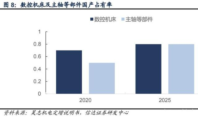 电主轴等数控机床部件进口替代趋势明显,市场空间广阔。我国数控机床功能部件发展相对缓慢,工业化和专业化程度相对较低,电主轴.数控系统.虽然伺服系统已经形成了一定的生产规模,但只能满足中低档数控机床的需求,国内中高档数控机床使用的功能部件仍然依赖进口。根据《中国制造2025>重点领域技术路线图》,到2020年,高档数控机床本地化率将超过70%,电主轴本地化率将达到50%;到2025年,高档数控机床本地化率将超过80%,电主轴本地化率将达到80%。