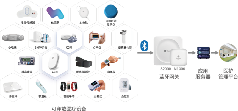 蓝牙物联网动态血糖CGM监测在智慧病房的成功应用,带动了其它蓝牙可穿戴医疗体征监测设备纷纷加入蓝牙物联网的行列。如便携式血压计、可穿戴式血氧仪、心电贴、胰岛素泵、心率仪、雾化器、肠音贴、生物传感器、连续听诊记录仪等等。常规生命体征监测均可通过“可穿戴医疗设备+物联网”的方式实现实时、连续监测,全面快速准确地捕捉患者生命体征,让医生护士在不接触患者和操作设备的情况下,精准监测患者身体状态,帮助医护人员第一时间发现患者的病情变化,实现生命体征异常风险预警,也为医生诊治患者提供科学的数据支撑,极大地减轻了医护工作者的工作强度,提高了工作效率。