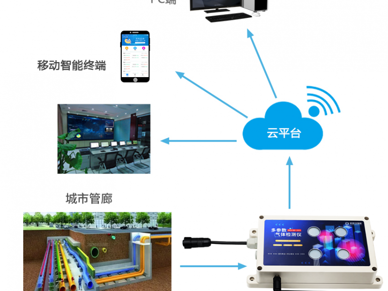 地下管廊装有各种有线信号线、热力管、燃气管、电信管道、给水管道、电力管道等等,是一个多种信号与传输对象交汇的场所,所以需要对其内部环境进行监测,以达到实时、自动监测地下管廊内的环境的目的,把危险防范于未然。