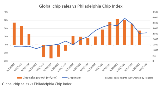 全球芯片销售增速与费城半导体指数的走势对比