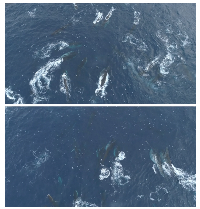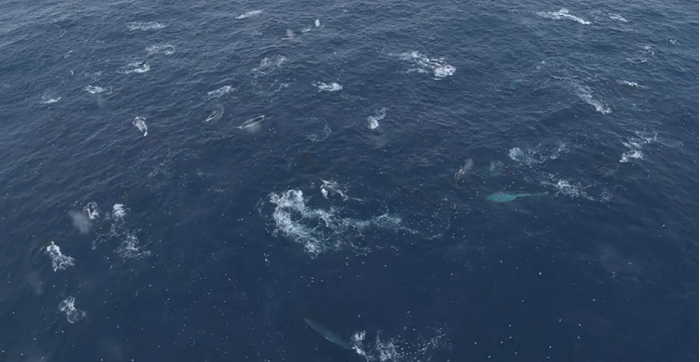 他们的调查发现了巨大的鲸鱼群体在捕食磷虾,这是该地区最重要的物种之一,有两次观察估计大约有150头鲸鱼都在捕食磷虾群。他们指出,这是文献中最大的须鲸聚集地(《七个世界,一个星球》纪录片中也有介绍)。摄食狂潮只持续了几分钟,然后鲸鱼又分散开来。
