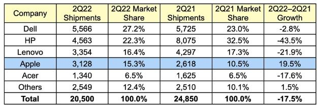 编者也留意到,另一方面,市场研究公司IDC昨日也发布了自己的出货量预估,表示本季度苹果Mac销售情况会更加严峻。根据IDC的数据,苹果在2022年第二季度仅出货了480万台Mac,同比下降22.5%,本季全球PC出货量总共下降了15.3%。