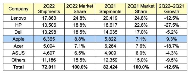 7月13日消息,根据Gartner的数据,2022年第二季度全球PC出货量总计7200万台,比 2021年第二季度下降12.6%。与此同时,苹果第二季度全球Mac出货量同比增长9.3%,同期美国Mac出货量增长19.5%。