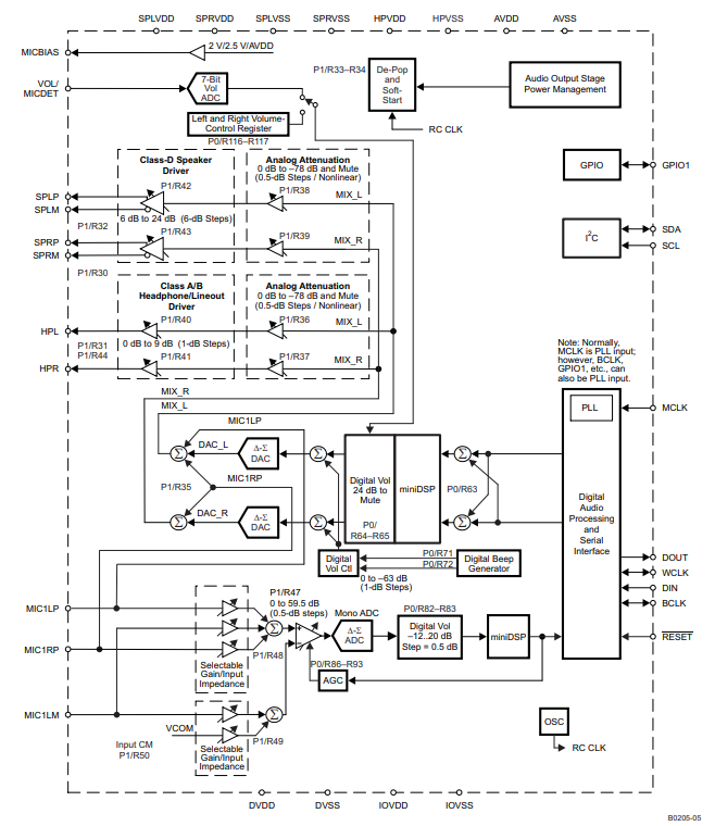 片上 PLL 提供数字信号处理模块所需的高速时钟。音量可以通过引脚控制或寄存器控制来控制。使用 I 2 C 串行总线控制音频功能。