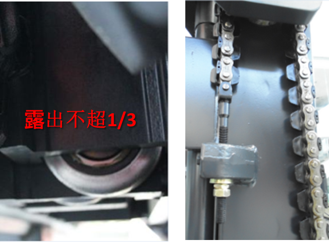 ■当门架降到最低并后倾时,货叉架底部滚轮如露出超1/3,须马上调节链条螺杆