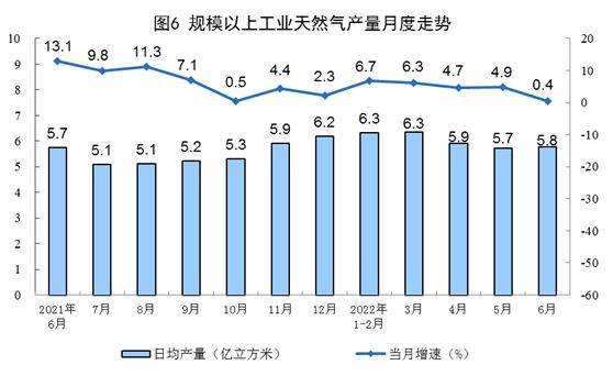 6月份,规模以上工业原煤、原油、天然气、电力生产均保持增长。与5月份相比,原煤生产增速加快,原油保持稳定增长,天然气生产放缓,电力由降转增。