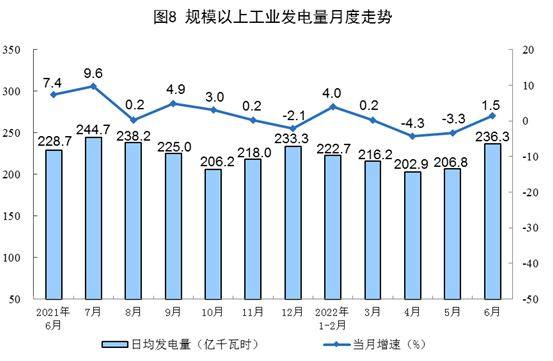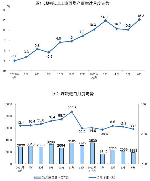 原煤生产增速加快,进口降幅扩大。煤炭保供政策有力推进,6月份,生产原煤3.8亿吨,同比增长15.3%,增速比上月加快5.0个百分点,日均产量1264万吨。进口煤炭1898万吨,同比下降33.1%,降幅比上月扩大31.0个百分点。