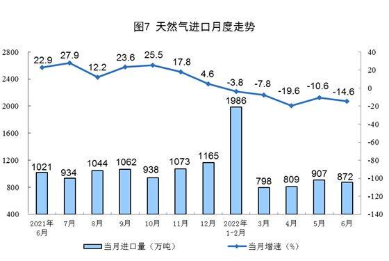 1—6月份,生产天然气1096亿立方米,同比增长4.9%。进口天然气5357万吨,同比下降10.0%。