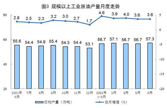 原油生产稳定增长,进口由升转降。6月份,生产原油1719万吨,同比增长3.6%,增速与上月持平,日均产量57.3万吨。进口原油3582万吨,同比下降10.7%,上月为增长11.9%。