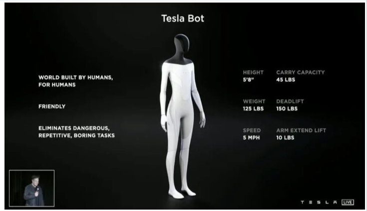 特斯拉CEO埃隆·马斯表示将于9月30日特斯拉AI日公布人形机器人Optimus,最早将于2023年开始生产。这款人形机器人身高1.72米,体重56公斤,类似一位普通成年男性,可以8km/h速度运动,面部有一个重要信息显示屏,具有40个自由度,多颗机器视觉(autopilot)传感器作为感知入口,内置FSD芯片,同时具有一颗只读芯片确保安全,同时机器人具备人机协作的特点确保足够柔性和安全,按照发布会定义,这款机器人将从事一些危险、重复或无聊的工作。马斯克表示,特斯拉未来的人形机器人Optimus是2022年最重要的产品开发项目,甚至可能比汽车业务更重要。