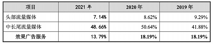 毛利率的下降就与阿里有关。报告期内,易点天下效果广告毛利率从18.19%降至13.79%。据招股书解释,流量供应商分为头部流量媒体(Google等)以及中长尾媒体(除头部之外),与影响力相反的是,若客户选择头部流量媒体带来的毛利率更低,2021年为7.14%,而同期中长尾媒体毛利率为48.66%。