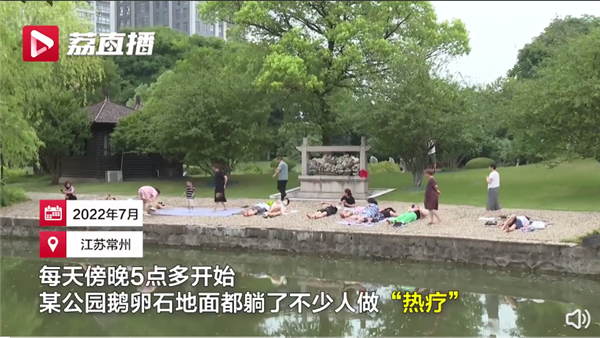 据江苏新闻报道称,最近每到傍晚,常州某公园的鹅卵石地面就躺了不少人做“热疗”,有的甚至直接赤膊或光脚上阵。