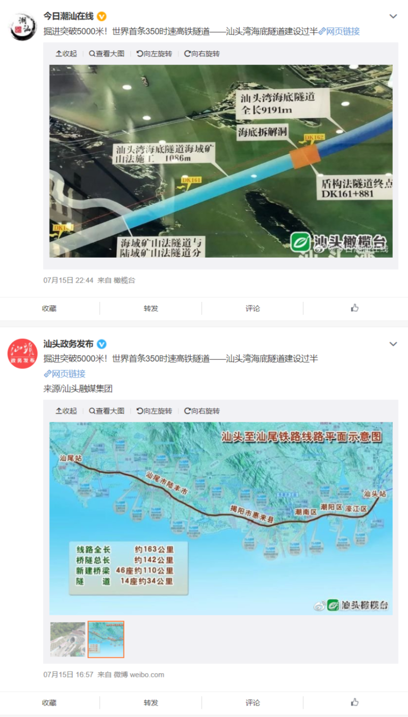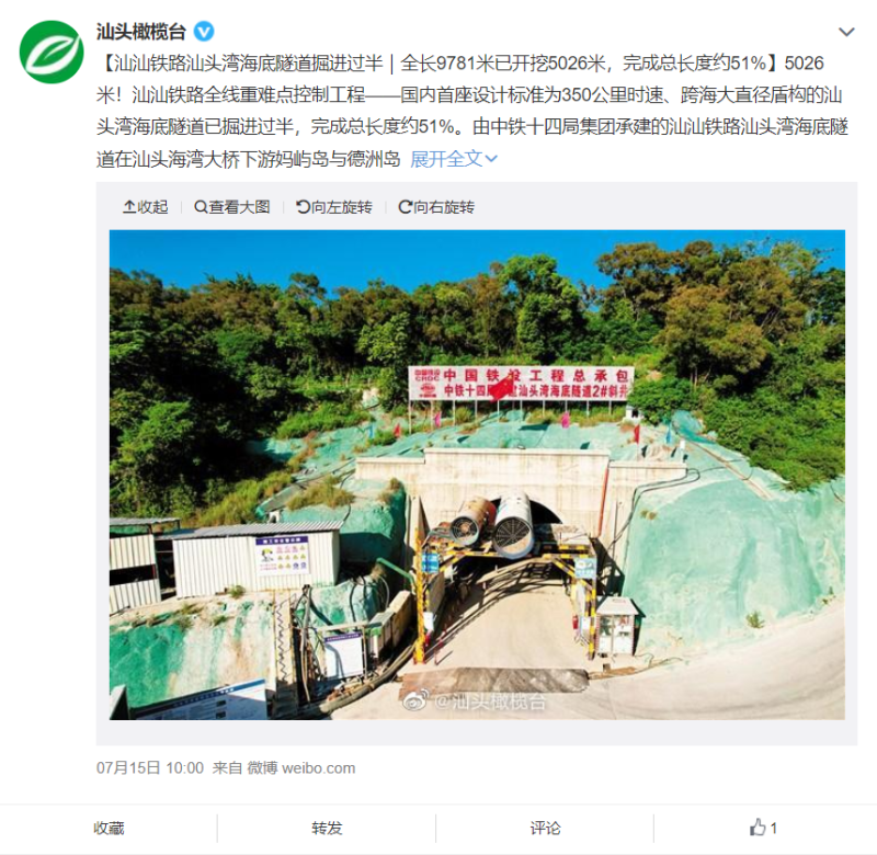 汕头湾海底隧道是世界首条 350 公里时速高铁过海隧道,也是目前盾构直径最大的跨海高铁隧道。隧道全长 9781 米,其中陆域矿山法段 5636 米,海域矿山法段 1126 米、盾构段 2129 米、明挖段 890 米。