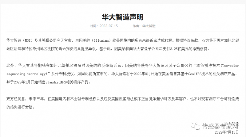 在今年5月份,中国基因测序企业华大智造与全球仪器仪表巨头illumina打了一场关于微流控传感器专利技术的官司,最后华大智造全面逆转胜利,并获赔22亿元!具体事件分析可见《获赔22亿!中国传感器罕见的胜利!这家企业在美国地盘赢了一回》内容。