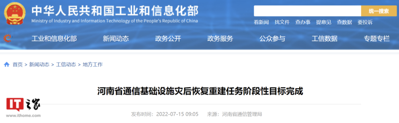 IT之家 7 月 17 日消息,据工业和信息化部网站,“7・20”特大暴雨灾害发生以来,河南省通信管理局组织河南信息通信业坚持统筹推进通信基础设施灾后恢复重建和应急能力提升。